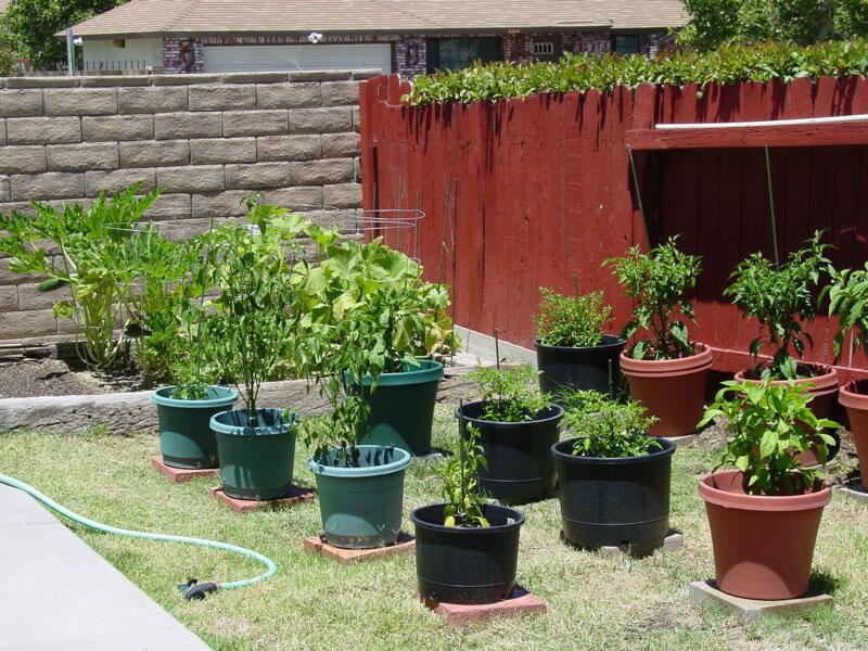 Garden plot on the left. Pepper plants in containers
