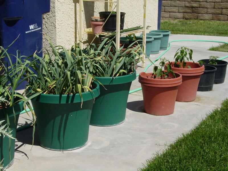 Garlic plants in containers
